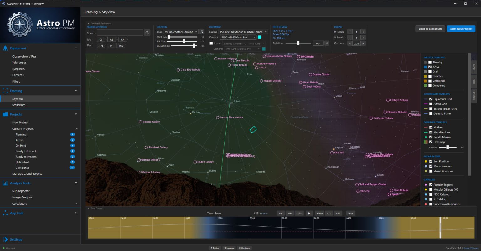 A complete astrophotography workspace — equipment management, project planning, sky framing, sub-frame analysis, calculators, and NINA cloud sync. One annual license covers it all.