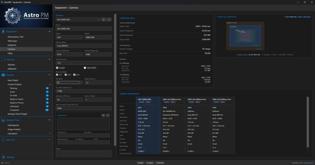 Detailed sensor specifications that power every downstream calculation. Define resolution, pixel size, bit depth, and binning modes. Set up multiple gain profiles with read noise, full well capacity, and e/ADU values that feed directly into the exposure calculator.