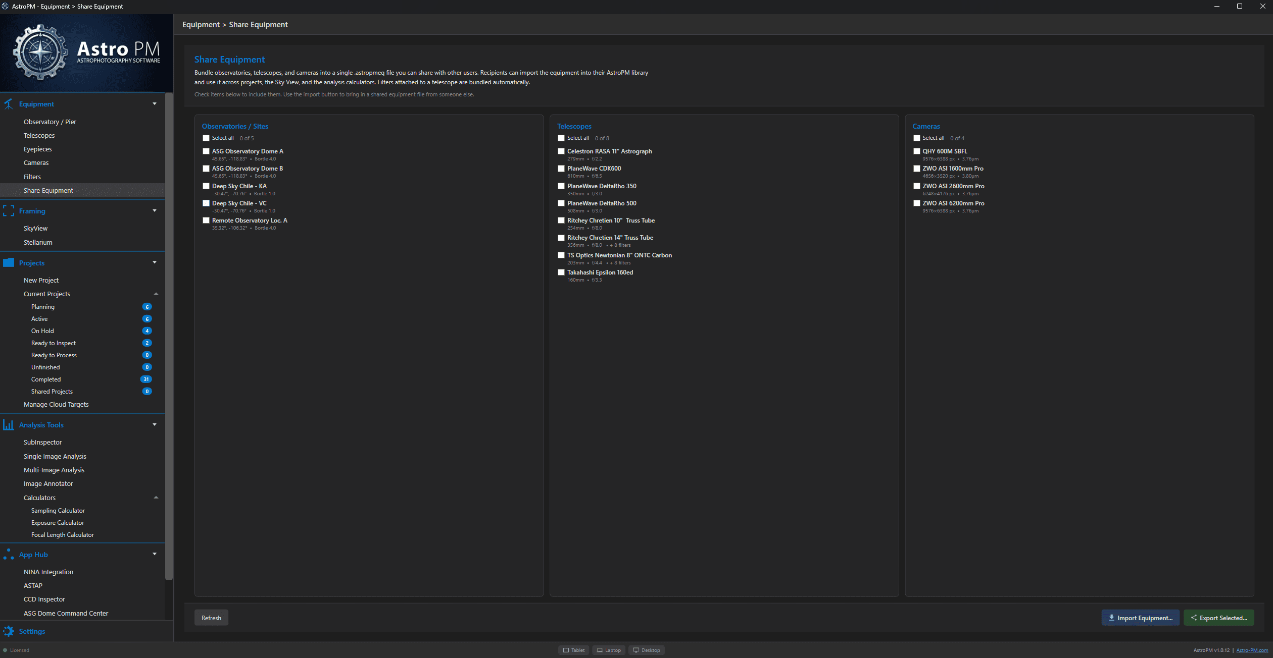 Share complete equipment profiles with friends, imaging partners, or technicians in seconds. Send a single scope, an entire imaging train, or your full library, including every spec, calibration value, and gain profile, exactly as Astro PM uses it.