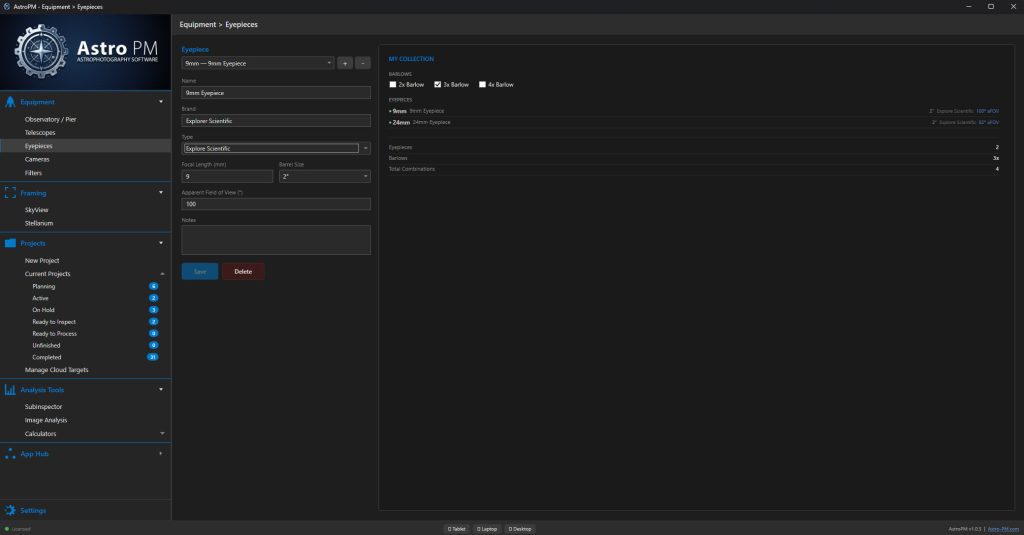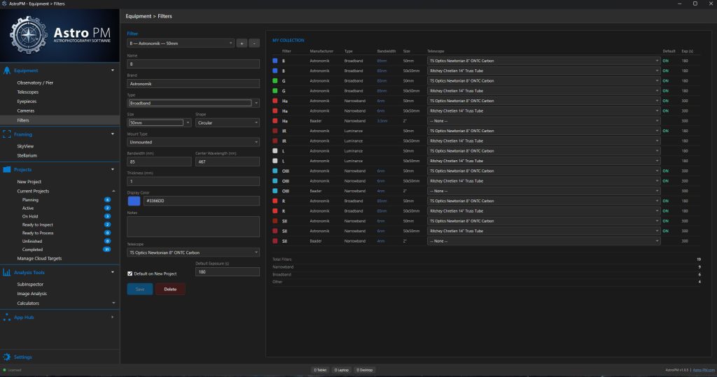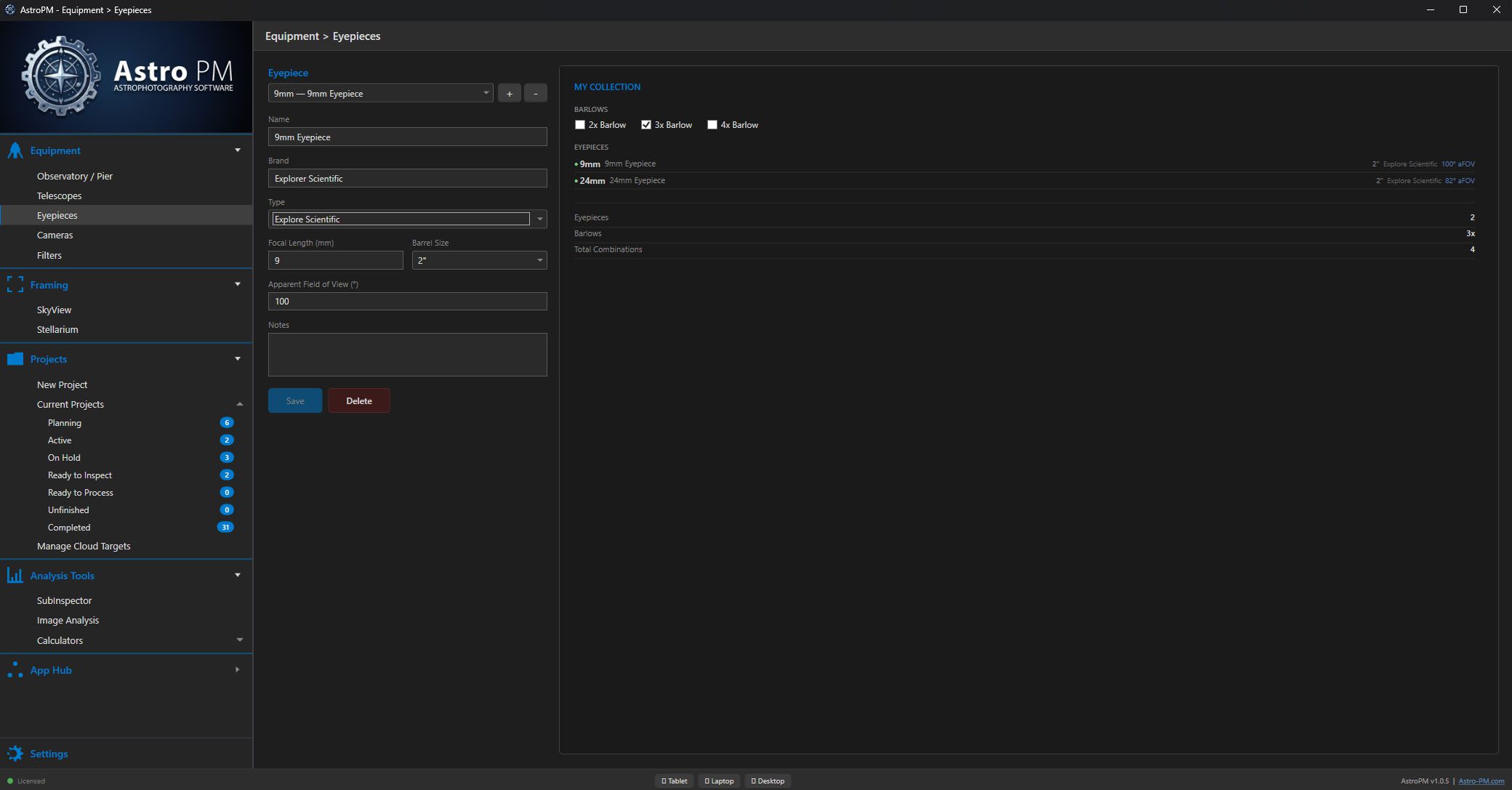 Every telescope, camera, filter, eyepiece, and observatory site lives in a structured equipment library. Change your scope or camera on a project, and every calculation updates throughout Astro PM.