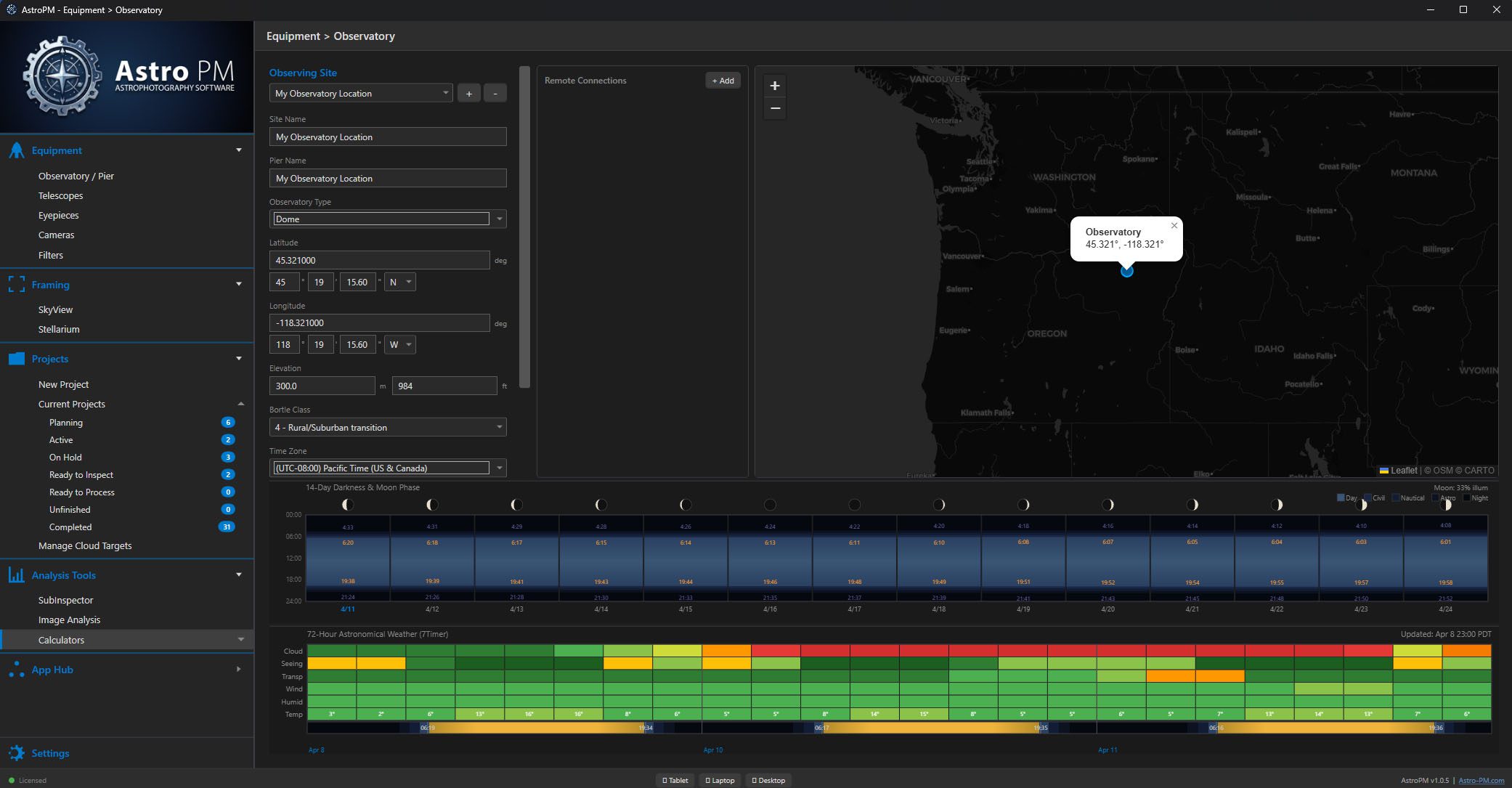 Track every location you shoot from as a full profile: geographic coordinates, elevation, time zone, Bortle class, typical seeing, and dome or roll-off roof type.