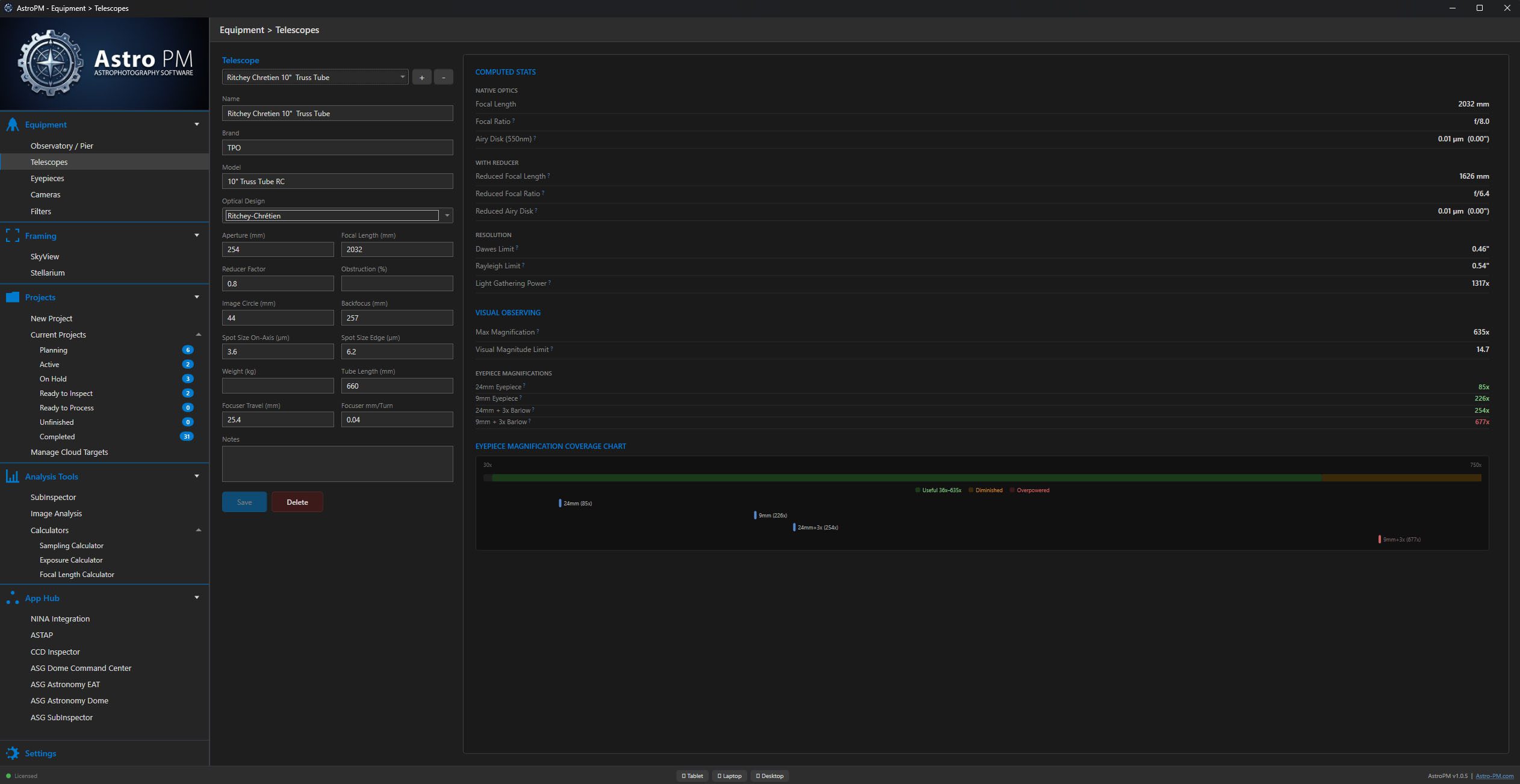 Full optical specification tracking with automatic calculations. Define aperture, focal length, focal ratio, and optical design. Add a focal reducer and see the reduced specs computed automatically.