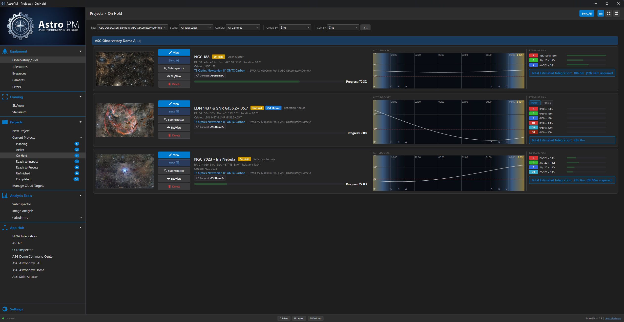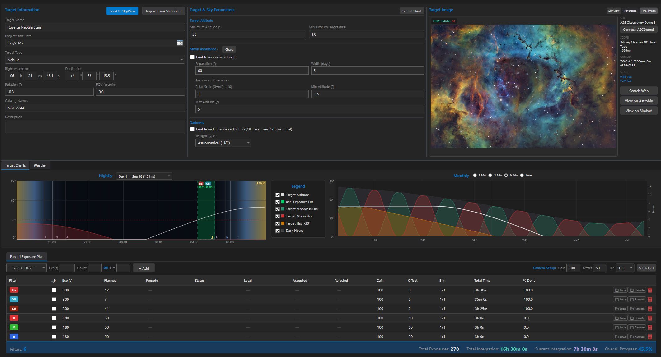 Build filter-by-filter exposure plans with per-panel settings. Track planned, acquired, and accepted frame counts. Flag narrowband filters as moon-safe and monitor total integration time automatically.