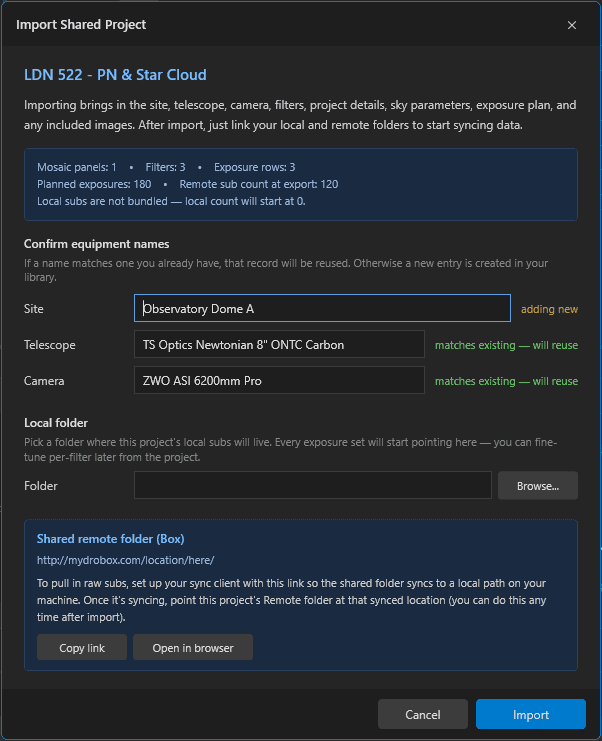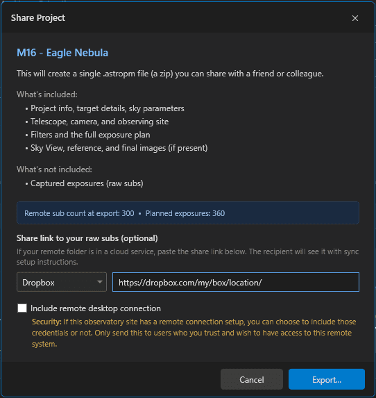 Export an entire project in one click: target details, sky parameters, exposure plan settings, observatory site, telescope, and camera specifications — plus remote access credentials when you need to hand the keys to a partner or technician. Attach a shared Dropbox, OneDrive, or Google Drive folder and everyone on the project can pull captured imagery without copying files around. Drop the export into any other Astro PM install to pick up exactly where you left off.