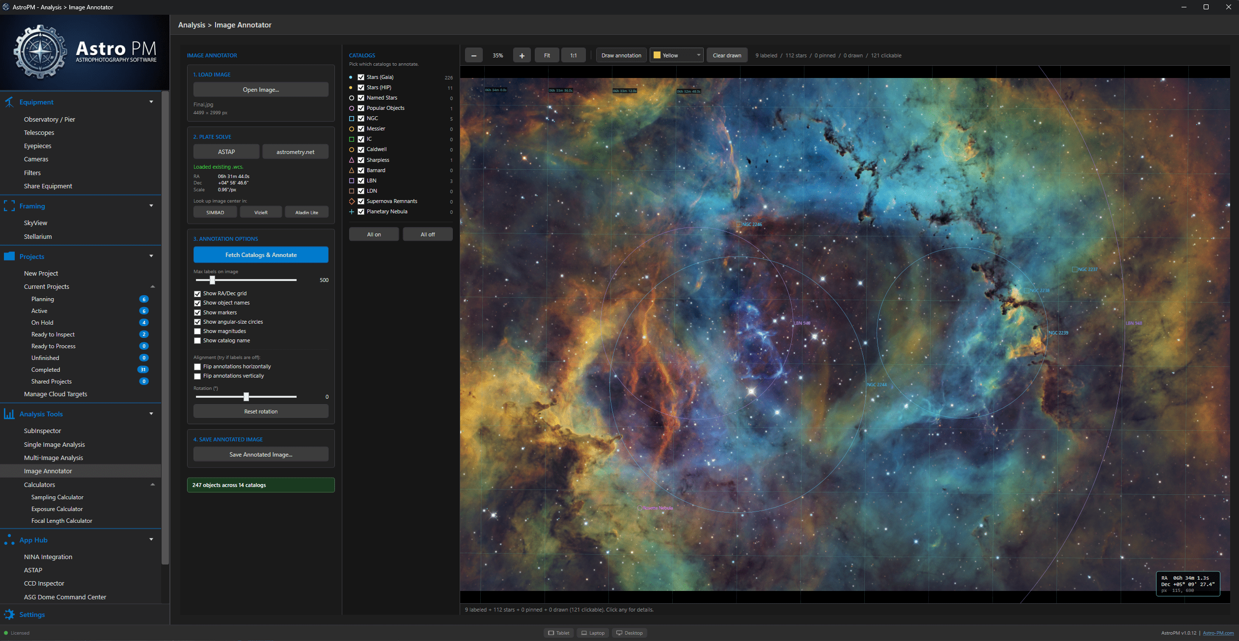 Astro PM scans your captured images, identifies stars and deep-sky objects, and annotates them against popular catalogs — NGC, IC, Messier, and more. Click any object to jump straight to its SIMBAD record for full astrophysical details, alternate designations, and references whenever you need to dig deeper.