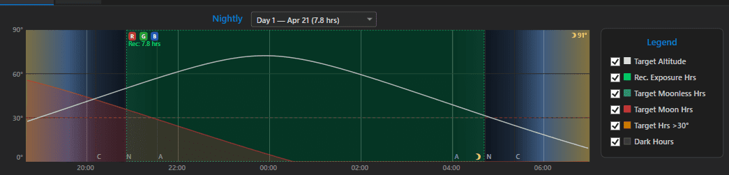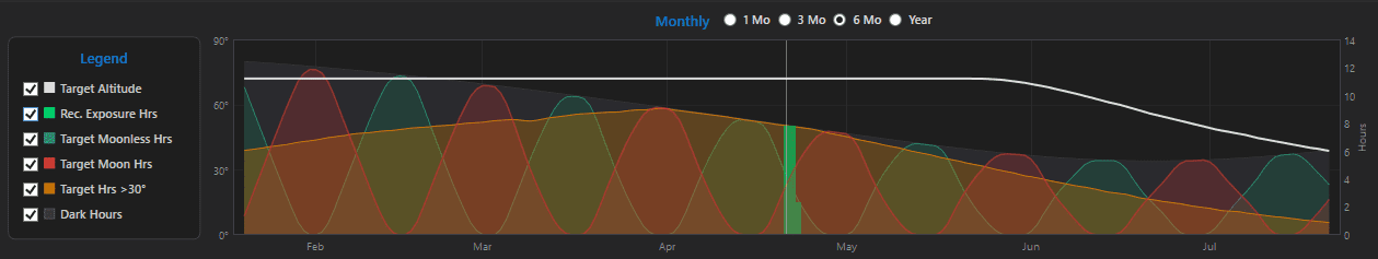 Every project shows you exactly when the target is worth imaging — both tonight and across the whole year. Altitude windows, moon-safe periods, and usable hours are modeled down to the minute.