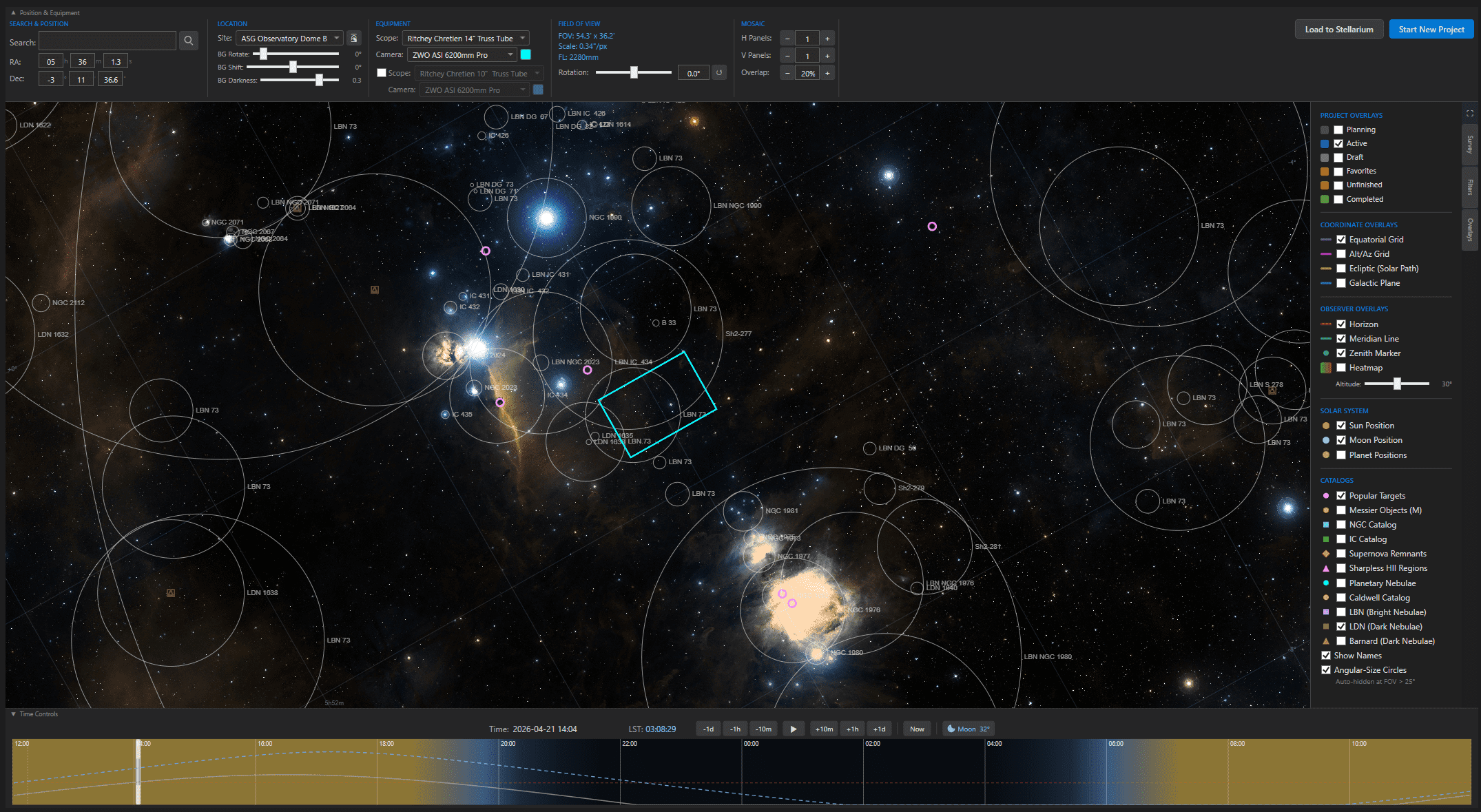 See exactly where you’ve imaged before. Every completed project’s footprint overlays on the sky map so you can find gaps in your history, discover nearby targets, and plan mosaic extensions to past work.