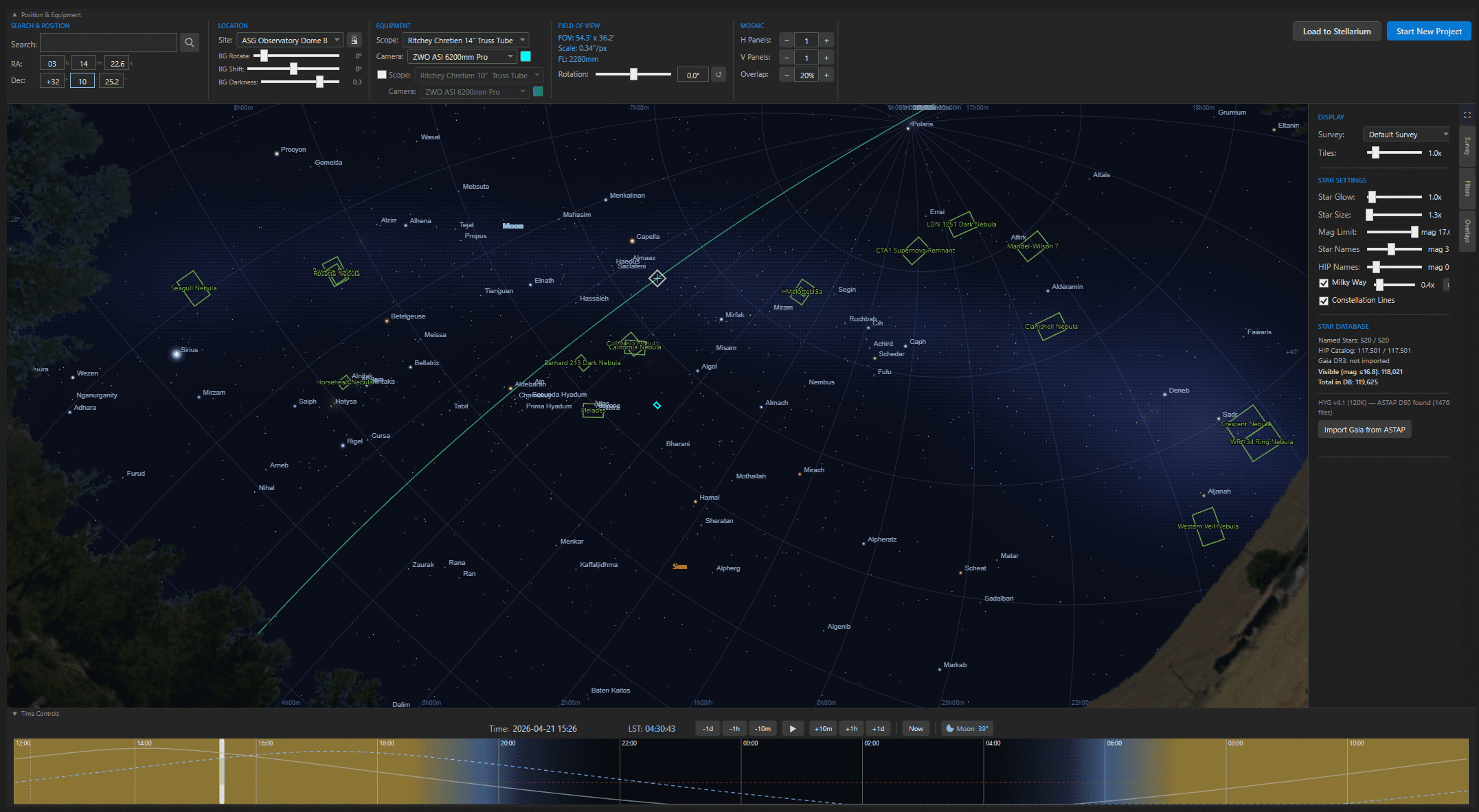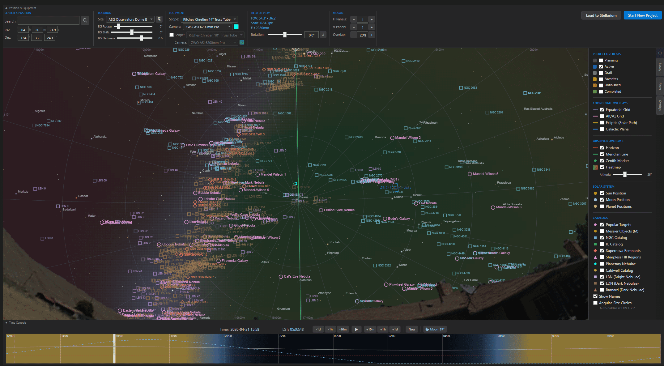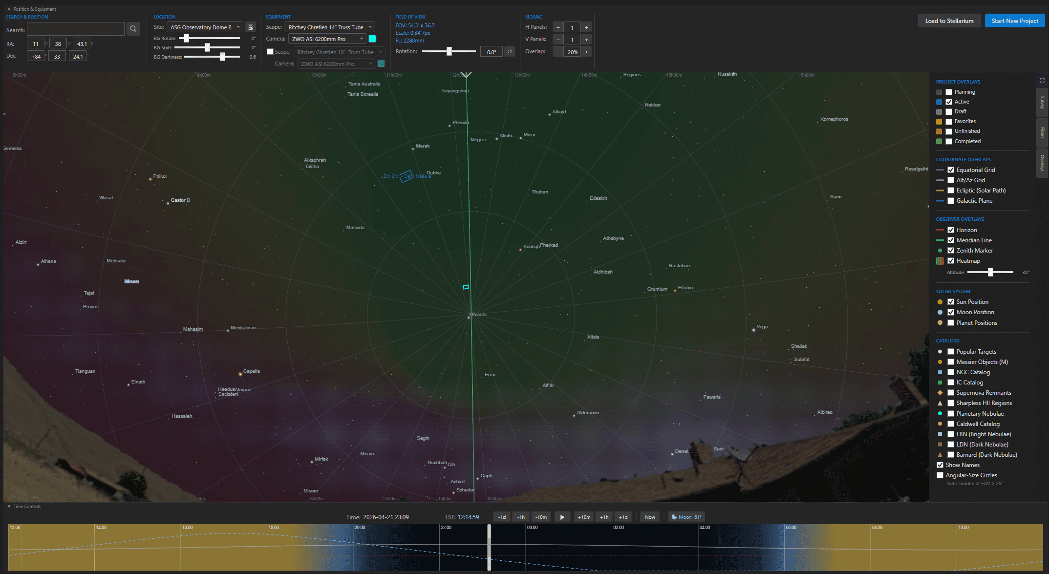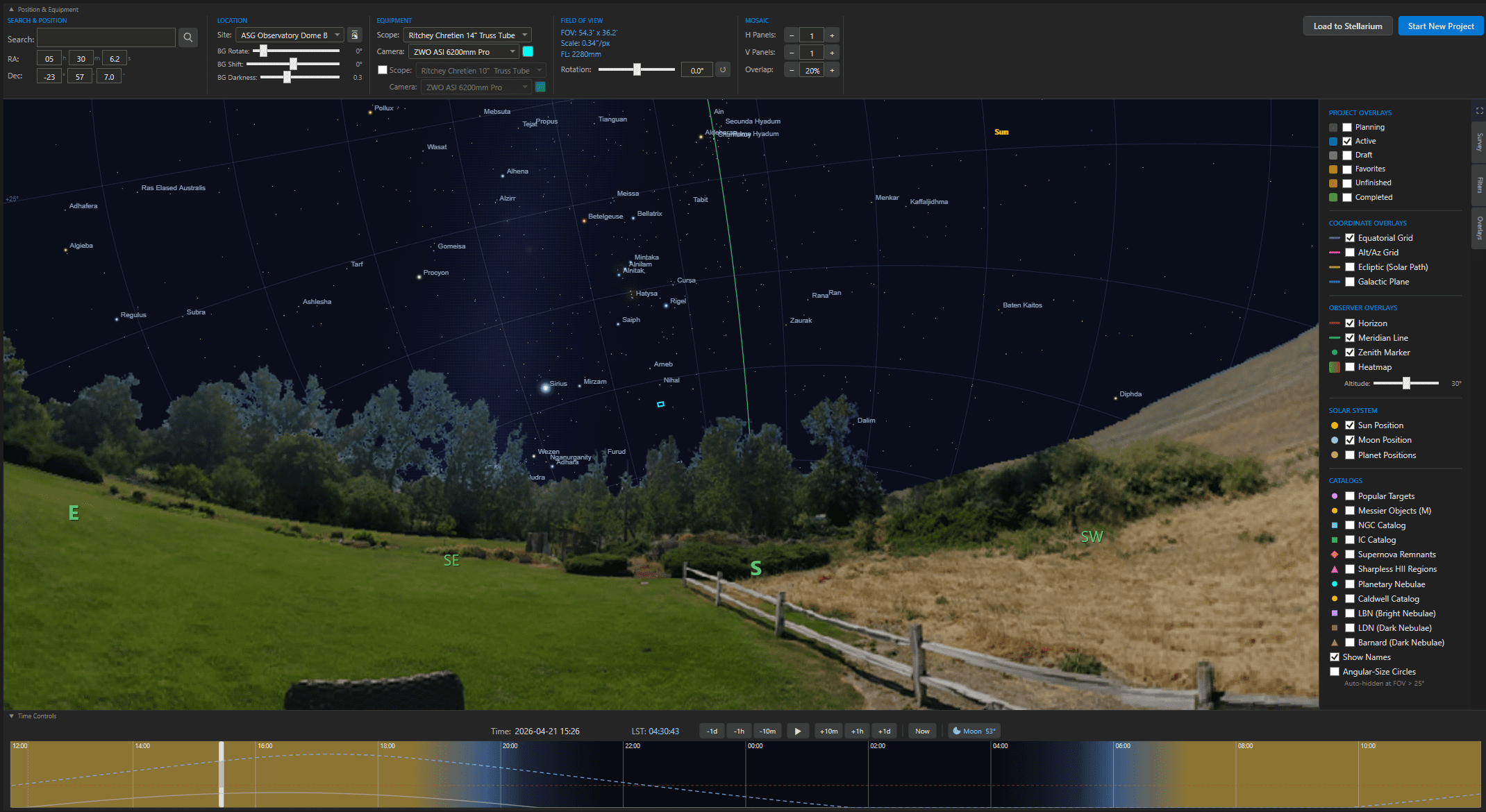 Altitude windows and usable-hours totals now reflect what you can actually image, not an idealized model. Store a different horizon per site for mobile or multi-location setups.