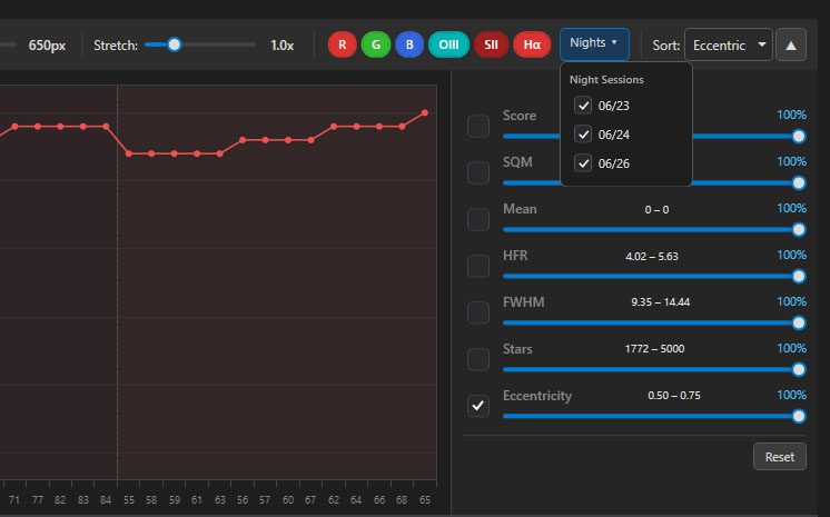 See every sub from a project on one screen, grouped by filter, with analysis of hfr, fwhm, sqm, mean, stars, eccentricity all plotted across the session. Outliers jump out, trends across the night are obvious, and every filter gets its own scoring band so narrowband and broadband are graded on their own terms.