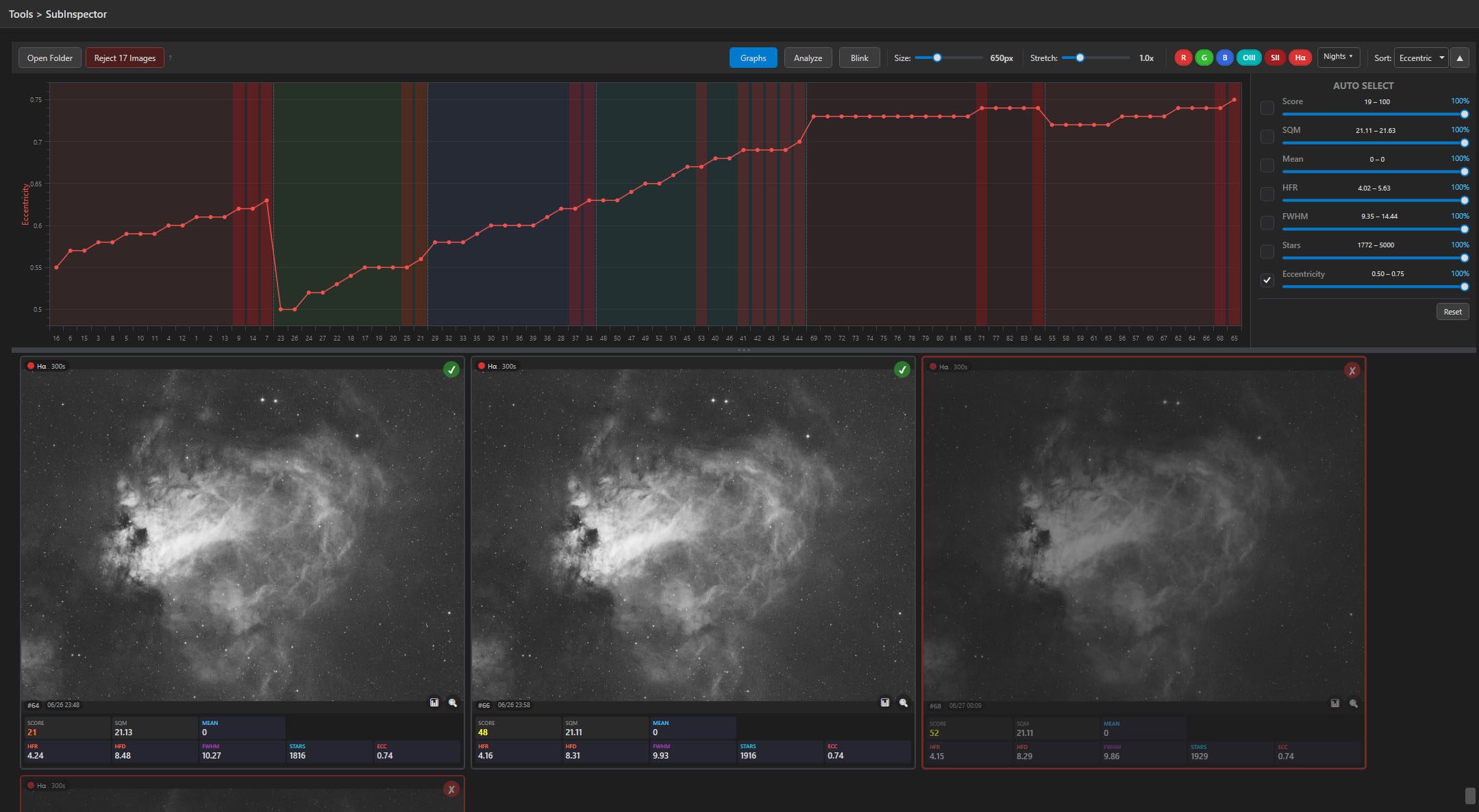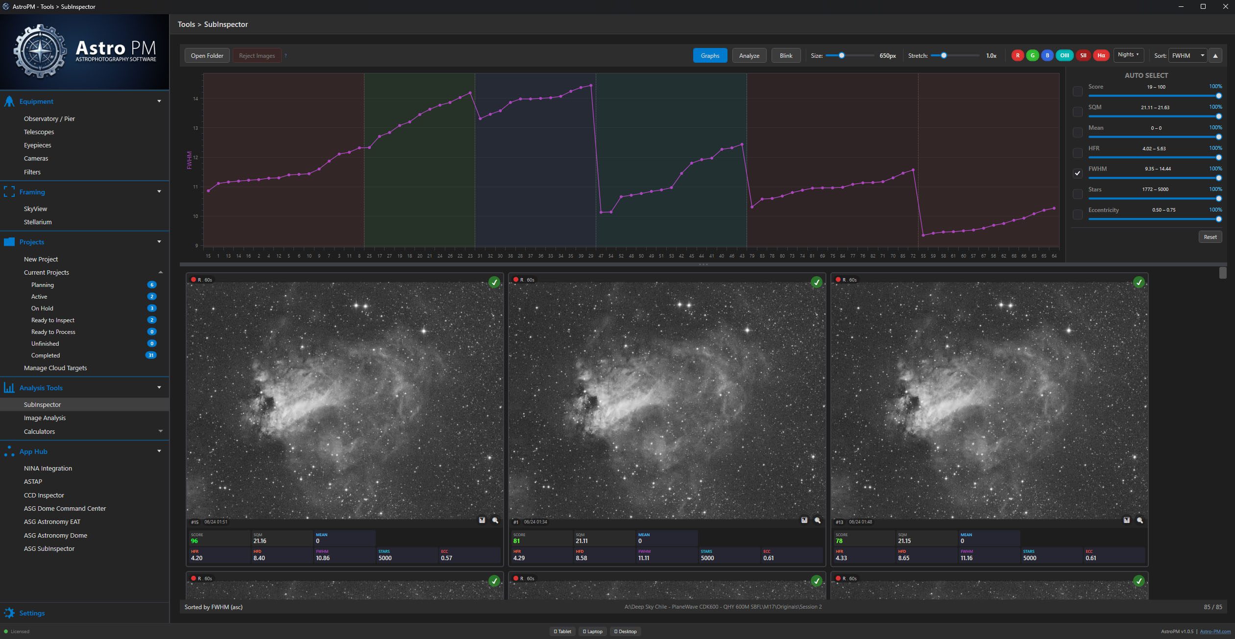 A purpose-built sub-inspection workspace. Score frames by filter, blink through a night, cull the bad, and feed the results straight back into your exposure plan.